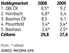 První místo v loňském pořadí největších hobbymarketů v Česku obhájila společnost OBI, jejíž 29 prodejen zvýšilo tržby z 8,5 miliardy korun v roce 2008 na 9,2 miliardy korun. To však byl jediný růst.