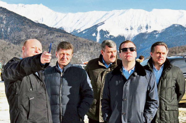 Ruský prezident Dmitrij Medveděv (druhý zprava) navštívil středisko Rosa Khutor, které bude hostit disciplíny alpského lyžování během zimních olympijských her v roce 2014. Centrem olympiády bude město Soči.