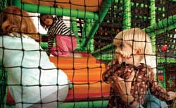 První dojem? Akvapark na suchu. Klouzačky, tobogany, ale voda nikde. Ohromí vás velká konstrukce s patrovým bludištěm. Pokud si ho chcete vyzkoušet a nebo jím doprovázet dítko, měli byste být pro jistotu ohební a štíhlí... S dětmi se projdete po rozhoupaných prknech, protáhnete se mezi válci, můžete zkusit chůzi po sítích. Nebo prolezete chodbou, která vyústí v "sebevražednou" klouzačku připomínající volný pád. Tam ale malým dětem hrozí potlučení, rodiče by pro ně tedy měli vyhledat méně adrenalinové místo.