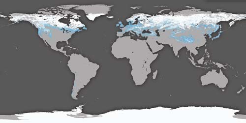 Satelit TERRA létá nad Zemí ve výšce 107 km. Jedním z jeho úkolů je sběr informací o sněhové pokrývce na Zemi a jejích souvislostech s nadmořskou výškou a teplotou. Mapa ukazuje, kde se sníh vyskytoval mezi 1. listopadem a 1. prosincem roku 2007. Co všechno současná věda o sněhu ví i jak se na něm bez rizika pohybovat, čtěte v tématu.
